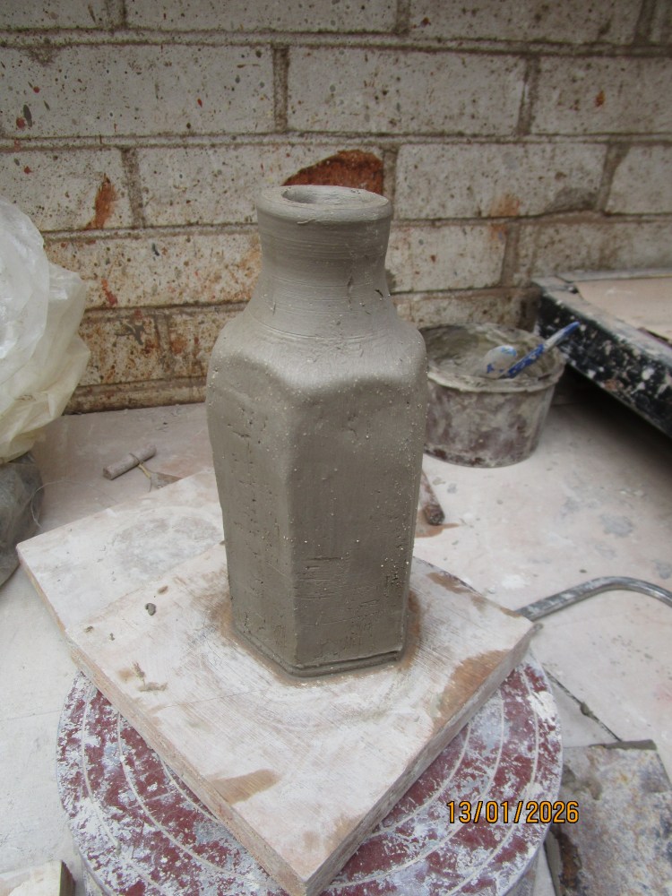 The three parts, body extruded , top thrown to fit a cork, and slab rolled for the base.